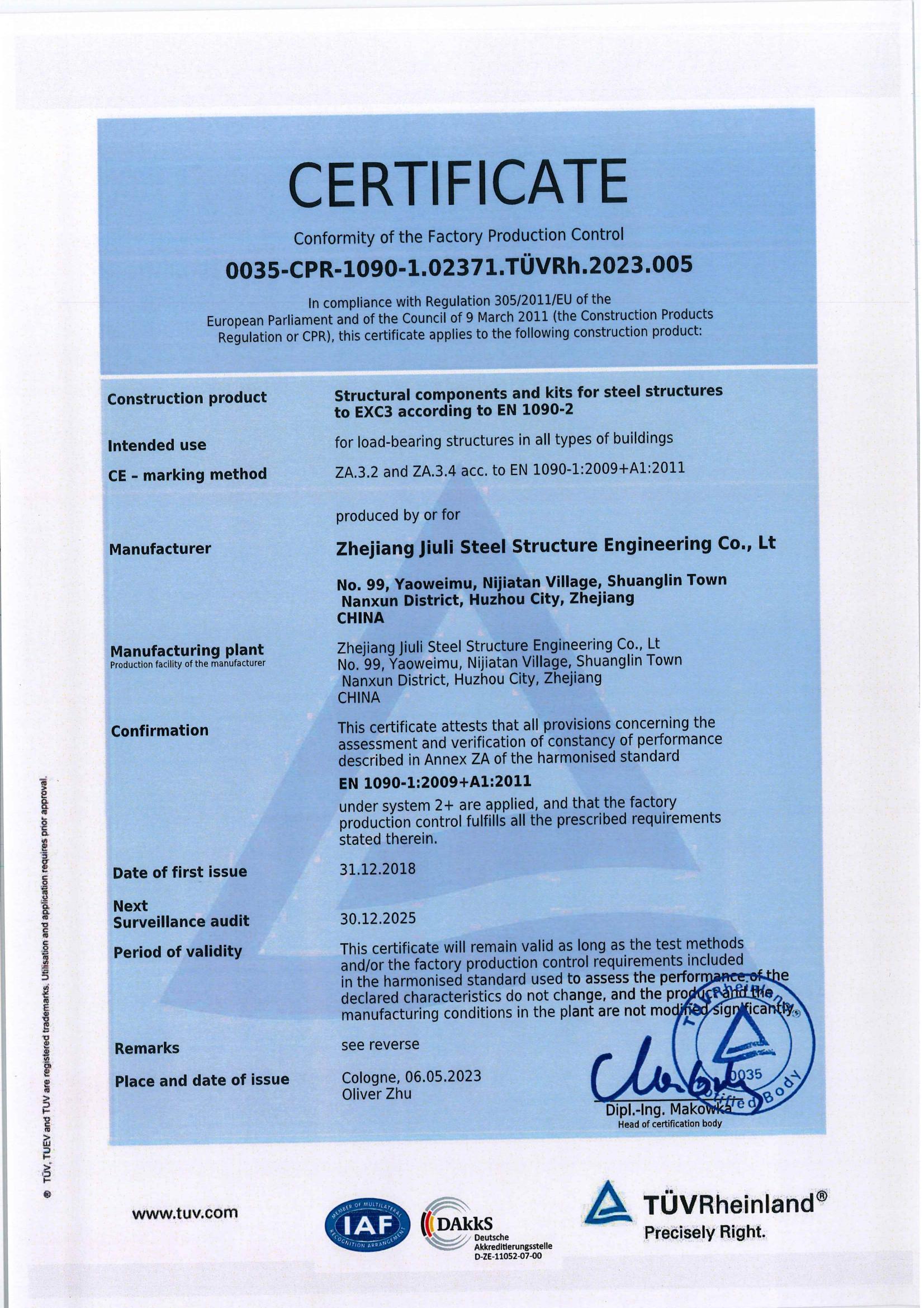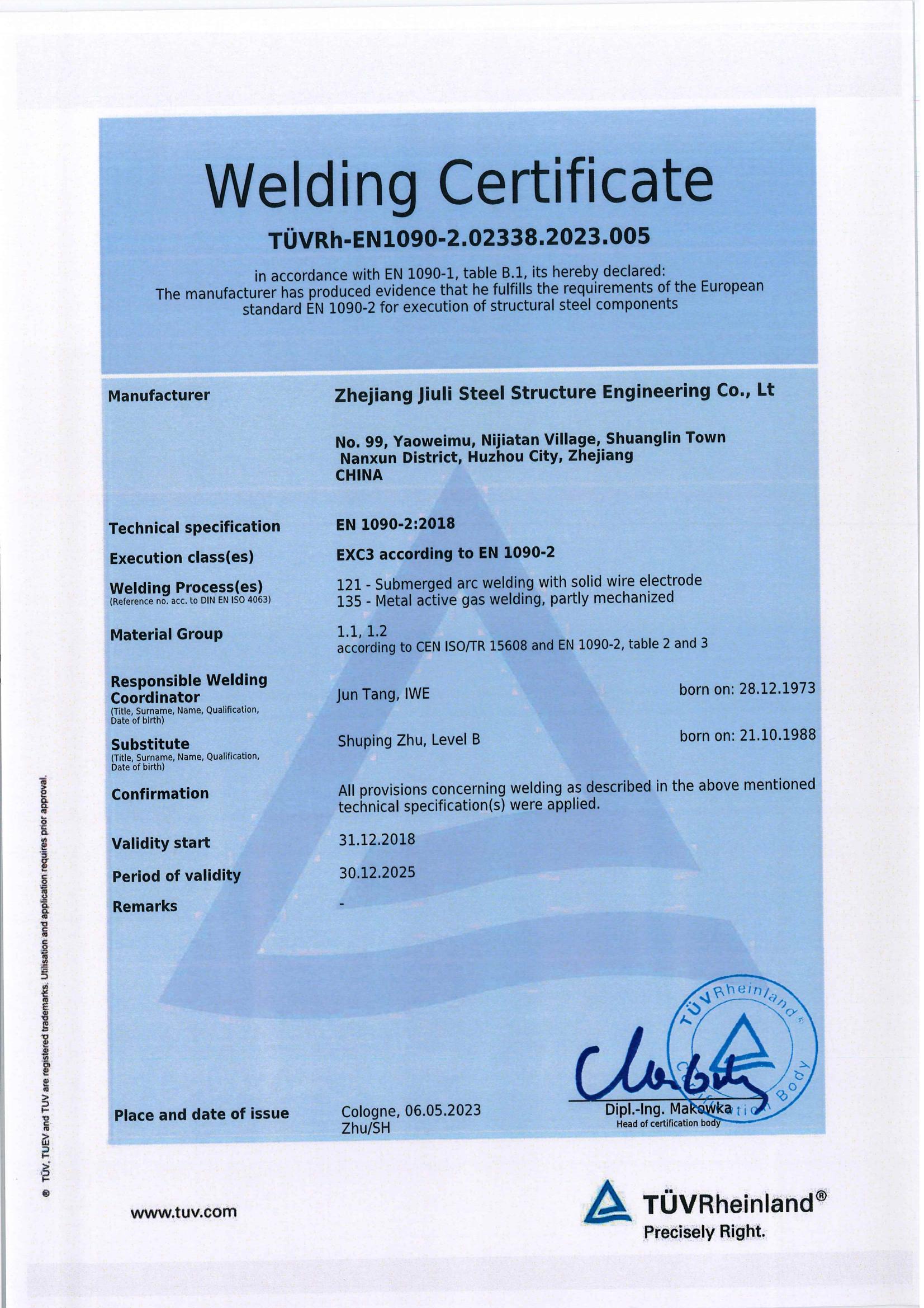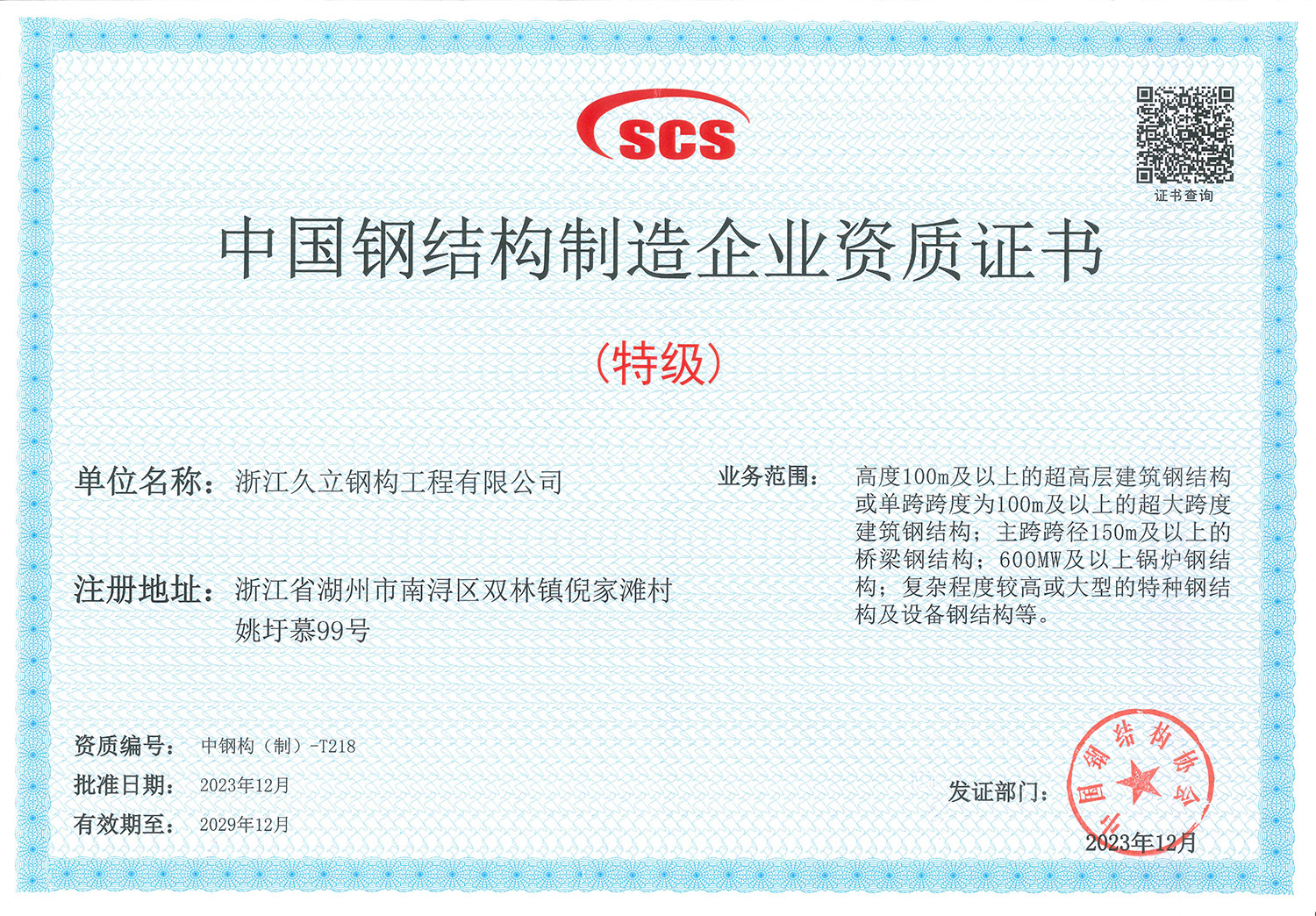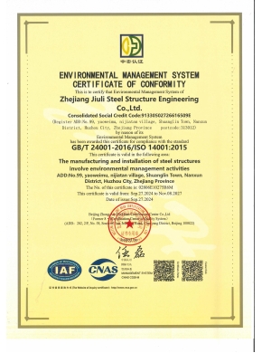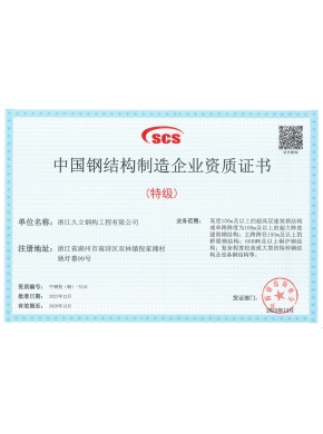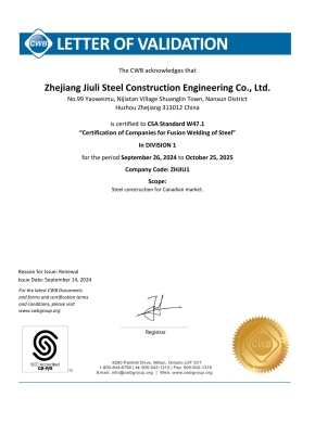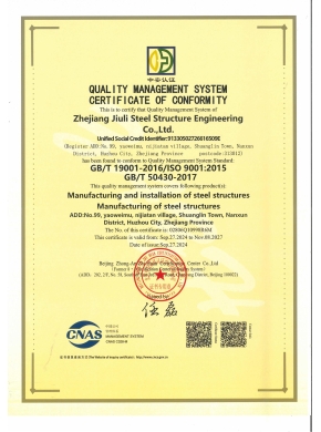 The company has a comprehensive quality assurance system and has passed the certification of ISO9001:2015 quality assurance system. Having the second level general contracting qualification for construction projects, the first level professional contracting qualification for steel structures, and the special manufacturing qualification issued by the Ministry of Construction. We specialize in undertaking the construction of various industrial and civil engineering projects, as well as the design, manufacturing, and installation of steel structures. The company is based in the domestic market and has established multiple marketing offices nationwide, gradually forming a nationwide marketing network and actively participating in international competition. The company has the Canadian CWB certificate, American AISC certificate, European EN1090 and ISO3834 certificate certified by the Canadian Welding Association, and can undertake the export processing of steel components with special requirements from Europe, America, Australia, and other countries. It has successfully established branches in Madagascar and Botswana in Africa. Jiuli Steel Structure is one of the first construction enterprises in the Huzhou region to enter the international market.