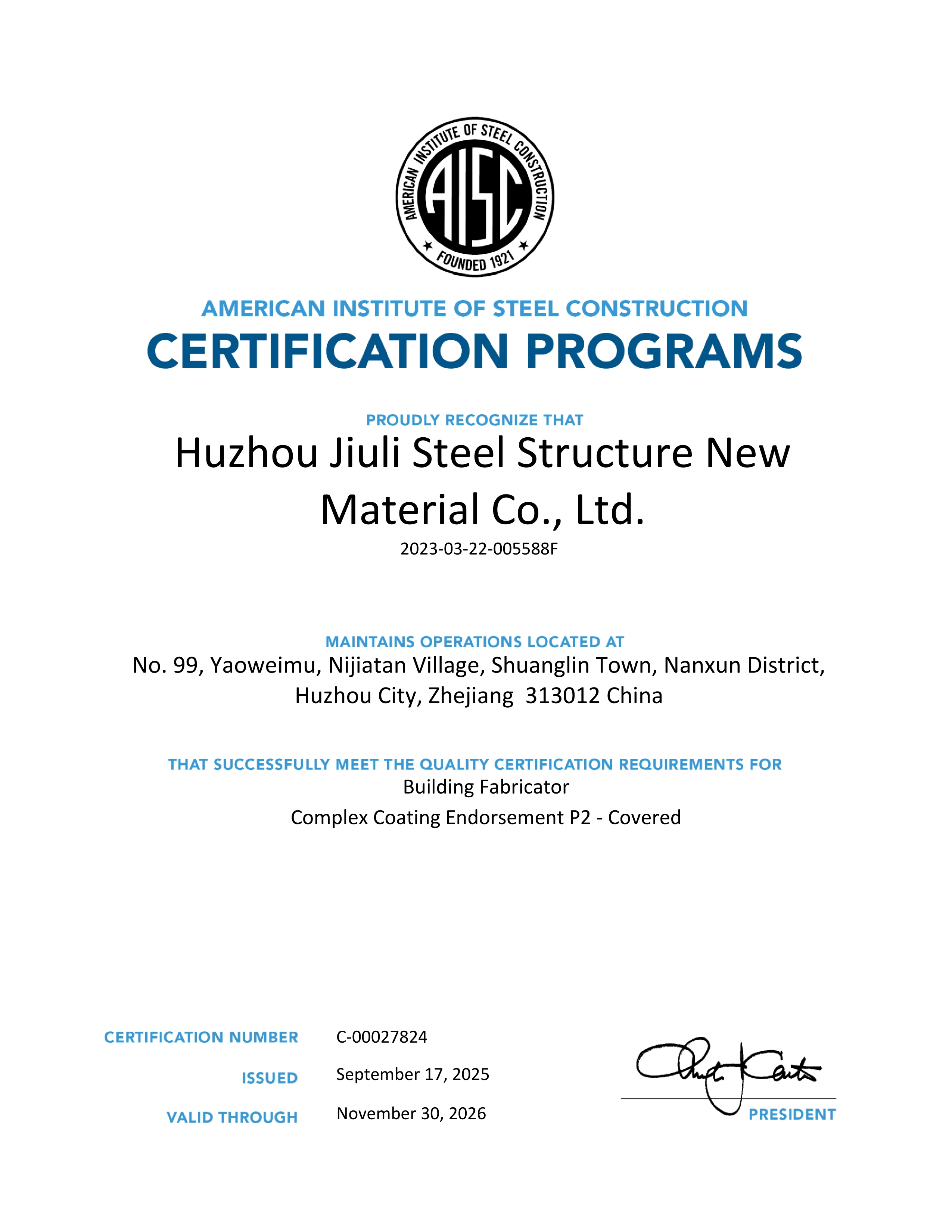 Zhejiang Jiuli Steel Structure Engineering Co., Ltd., founded in February 2001, is based in Huzhou City, the core area of the booming economy of the Yangtze River Delta in China. As a wholly-owned subsidiary of Jiuli Group, our company has not only been awarded honors such as Contract-abiding and Credit-worthy Unit, High-tech Enterprise, and AAA Credit Enterprise in Huzhou City but also holds important memberships in the China Steel Structure Association and the Steel Structure Branch of the Zhejiang Construction Industry Association, demonstrating our authoritative position and outstanding influence in the industry.